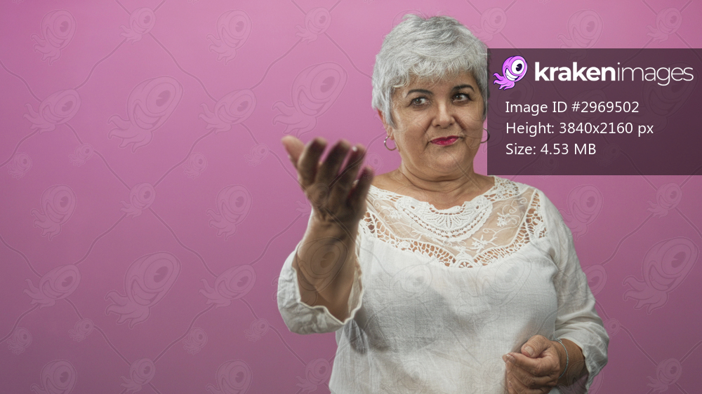 Woman senior grey hair plus size in white lace top extending open hand and palm toward camera in studio; welcoming invitation.
