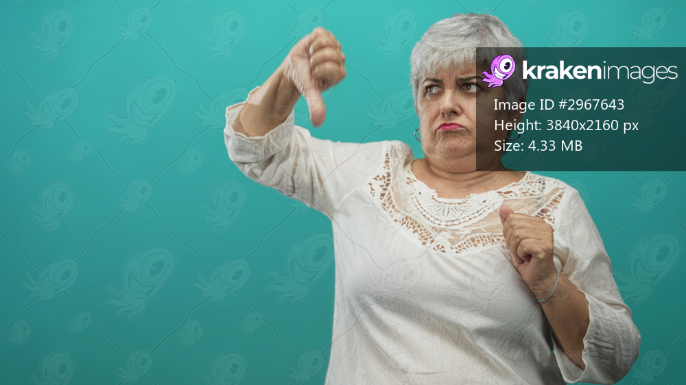 Woman senior with grey hair showing thumbs down with raised hand and pursed lips in studio; disapproval defiance.