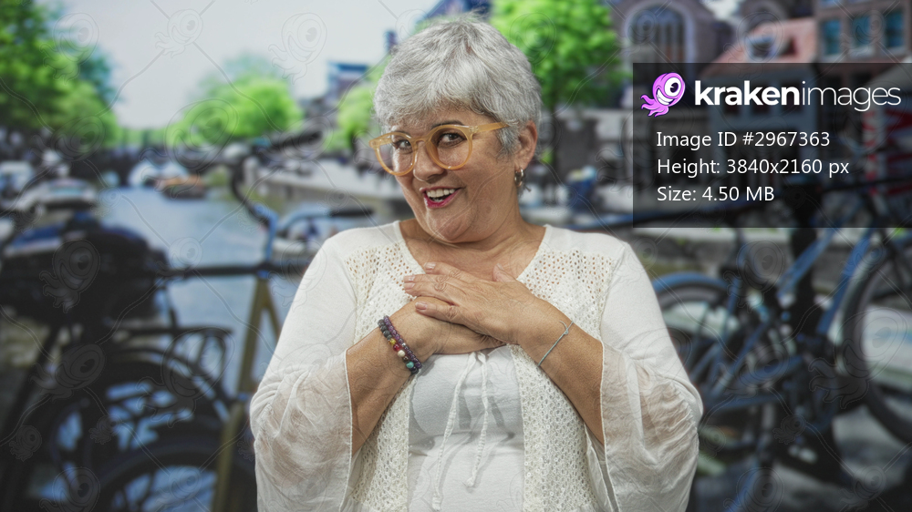 Woman senior with grey hair smiling, hands on chest, wearing glasses and white top beside bicycles along a canal street lined with buildings; gratitude kindness. - Kraken Images
