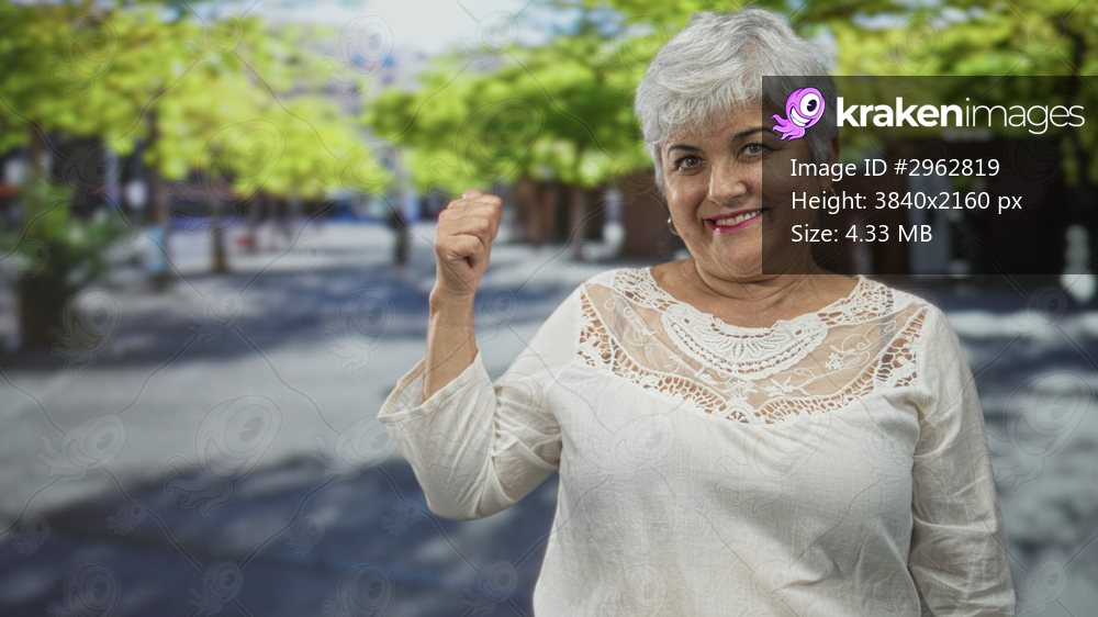 Woman senior with grey hair smiling and pointing to her chest while giving a thumbs up on a sunny pedestrian street wearing lace top; warm confidence.