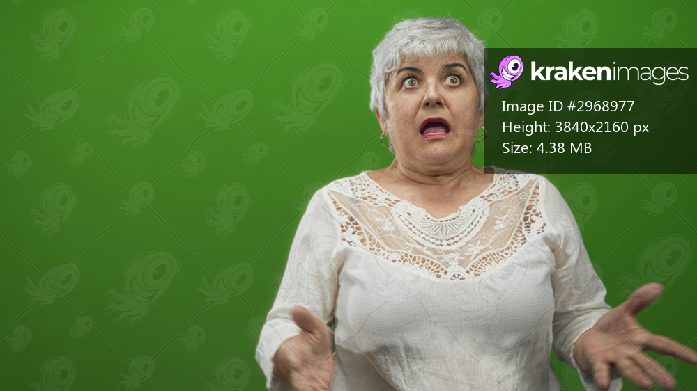 Woman, senior with grey hair and white blouse, palms up shrugging gesture and raised hands in a studio; bemusement uncertainty.