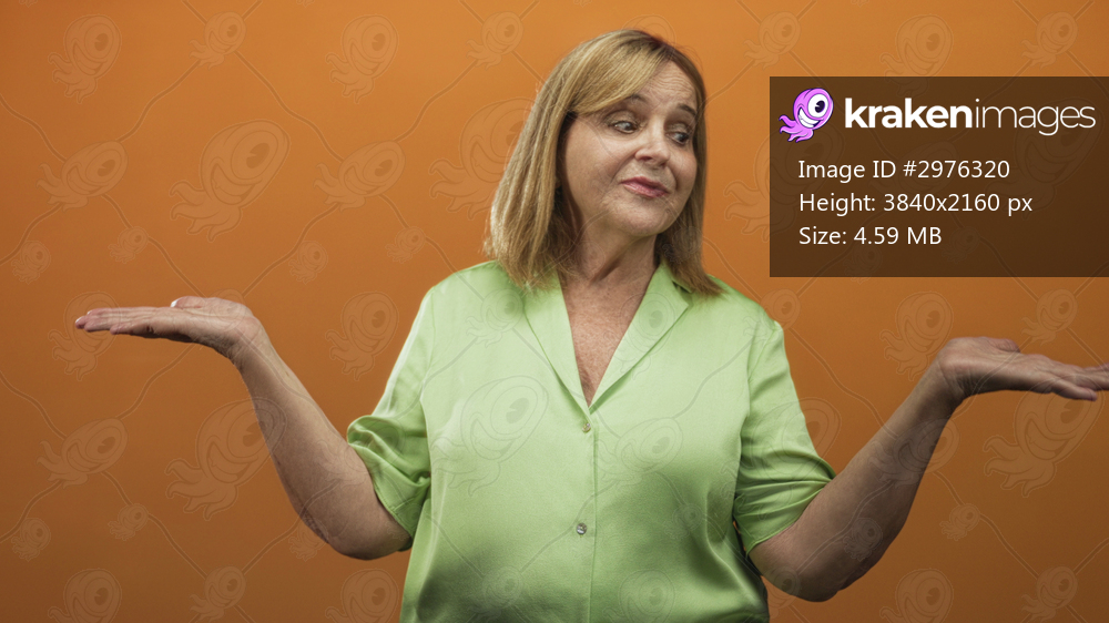 Woman senior hispanic blonde with palms up shrugging gesture in studio against orange backdrop wearing lime green blouse and pearl earrings; uncertainty decision. - Kraken Images