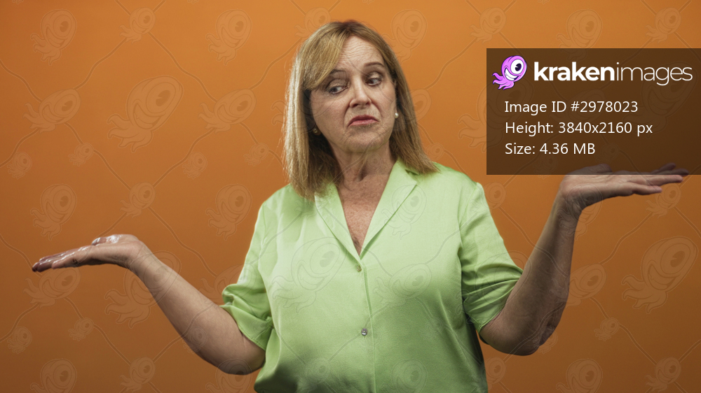 Woman senior hispanic blonde with palms up shrugging gesture in studio against orange backdrop wearing lime green blouse and pearl earrings; uncertainty decision. - Kraken Images