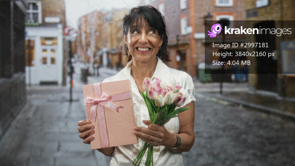 Woman senior hispanic holding a pink gift box and tulip bouquet, hands visible, standing on a wet street with shops and buildings; gratitude reflection memory. - Kraken Images