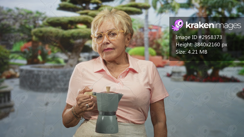 Woman senior hispanic holds moka pot with right hand on street by palm trees and stone fountain in a landscaped courtyard; quiet contemplation.