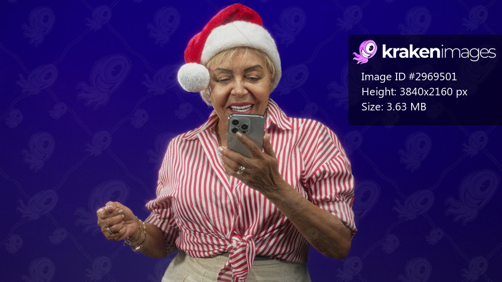 Woman senior hispanic in red striped shirt and santa hat taps smartphone with both hands and looks at screen in studio; holiday cheer.