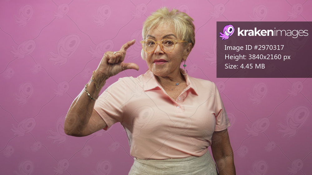 Woman senior hispanic pinches fingers to show small size with exposed hand and smile against a pink studio wall; playful joy.