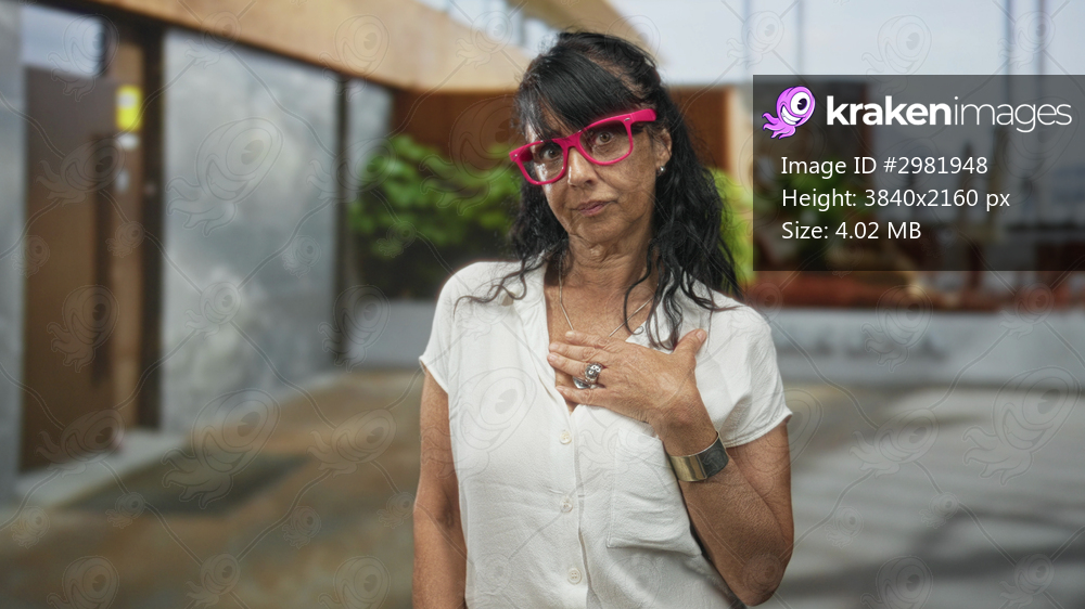 Woman senior hispanic with pink glasses, hand on chest in airport lobby by plants and windows, wearing white blouse, rings and cuff bracelet; gratitude reflection. - Kraken Images