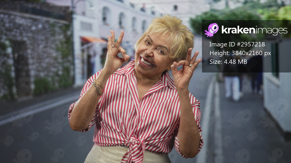Woman senior hispanic showing ok sign with both hands on a town street, smiling broadly in a striped shirt and bracelets; joy confidence.