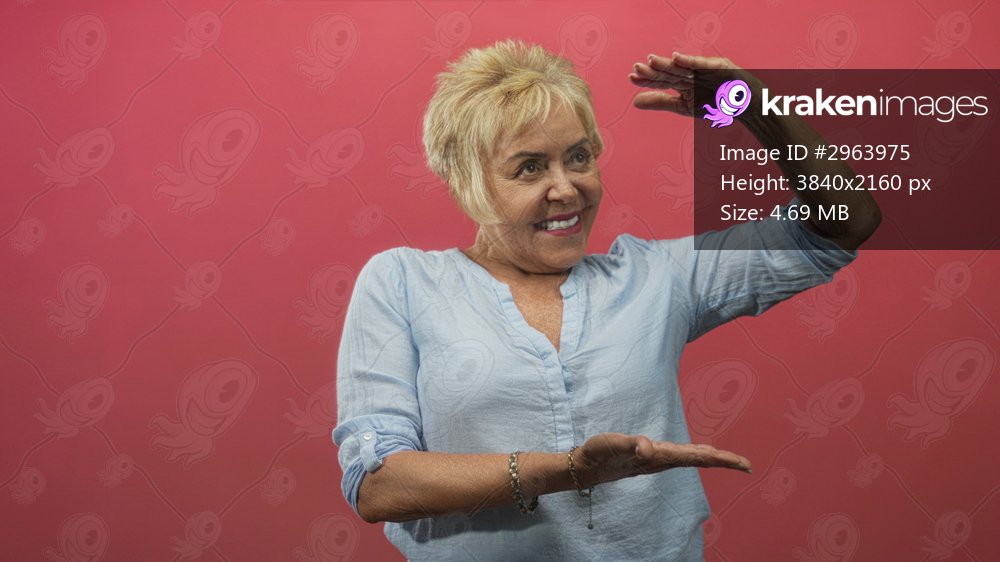 Woman senior hispanic smiles broadly and holds hands apart, framing space with hands in studio with pink backdrop; cheerful confidence.