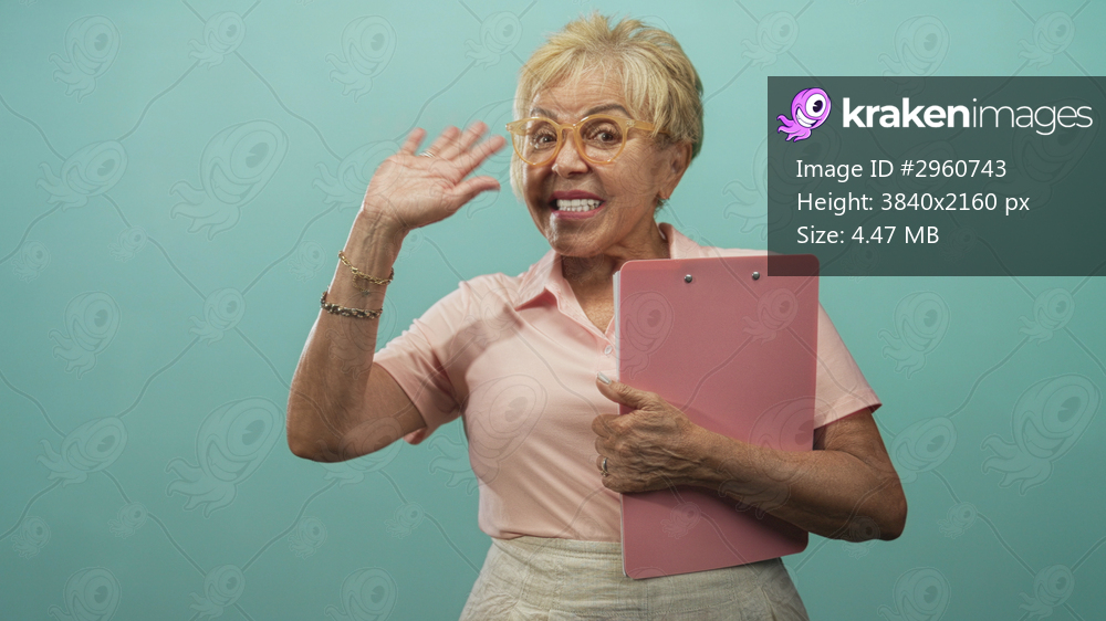 Woman senior hispanic smiling broadly while holding a pink clipboard and waving her right hand against a teal studio backdrop; joyful greeting.
