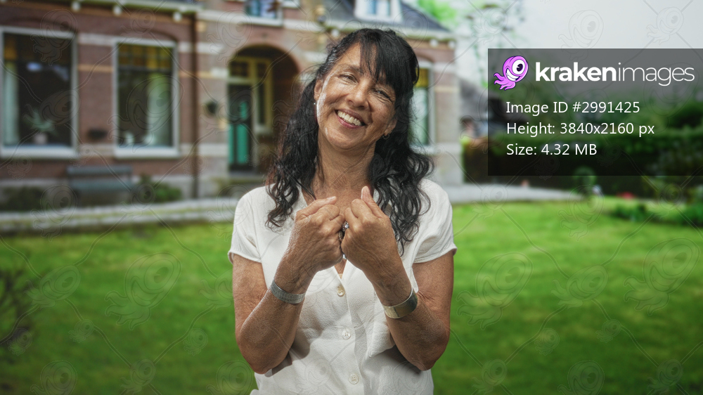Woman senior hispanic smiling with hands clenched near chest, wearing white blouse and bracelets, standing on green lawn in front of building; gratitude joy warmth. - Kraken Images
