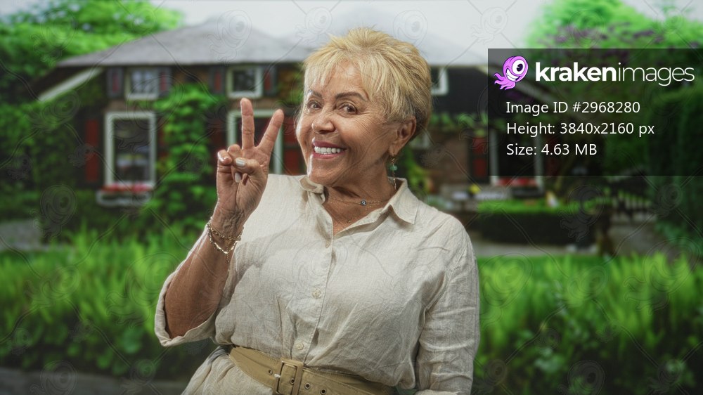 Woman senior hispanic smiling and holding up two fingers for peace, wearing a linen shirt, belt and earrings in front of a residential building with garden; joyful pride. - Kraken Images