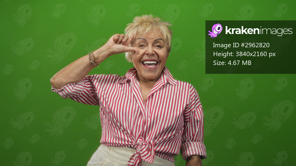 Woman senior hispanic smiling and making an eye circle with her hand in a green studio; playful joy.