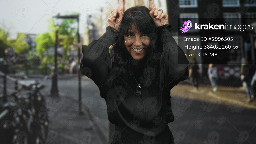 Woman senior hispanic smiling, wearing pendant necklace and black dress, hands making horns gesture on a cobblestone street with bicycles and buildings in view; playful joy. - Kraken Images