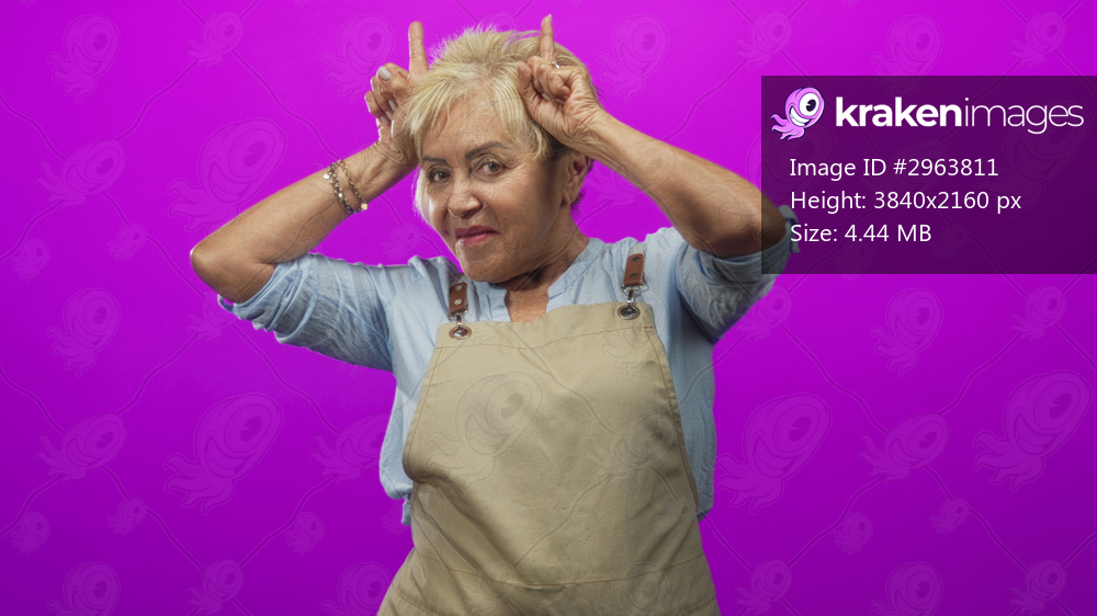 Woman senior hispanic wearing beige apron making index finger horns by head while posing in studio magenta backdrop with bracelet visible; playful mischief. - Kraken Images