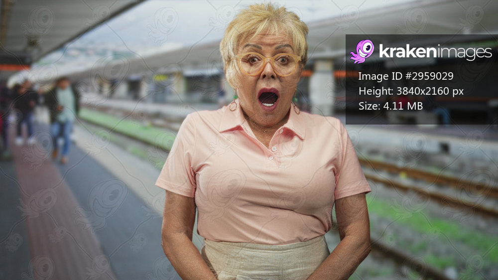 Woman senior hispanic wearing glasses with open mouth surprise gesture on a train station platform inside a building; surprise travel.