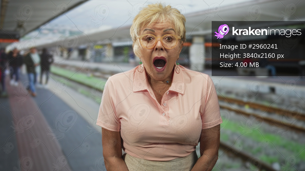 Woman senior hispanic wearing glasses with open mouth surprise gesture on a train station platform inside a building; surprise travel.