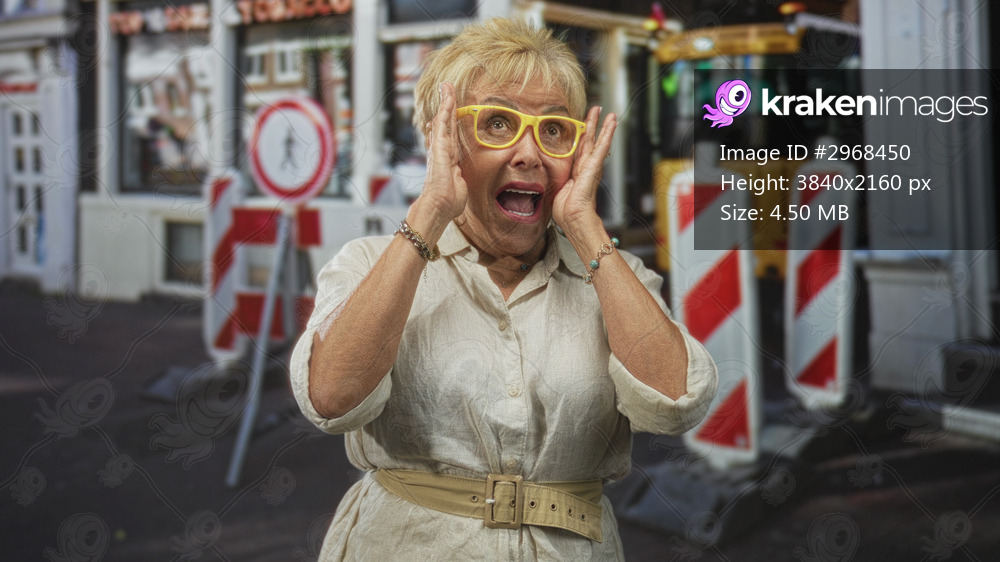 Woman senior hispanic wearing yellow glasses presses hands to cheeks with open mouth on urban street beside construction barriers and a pedestrian sign; surprise worry. - Kraken Images