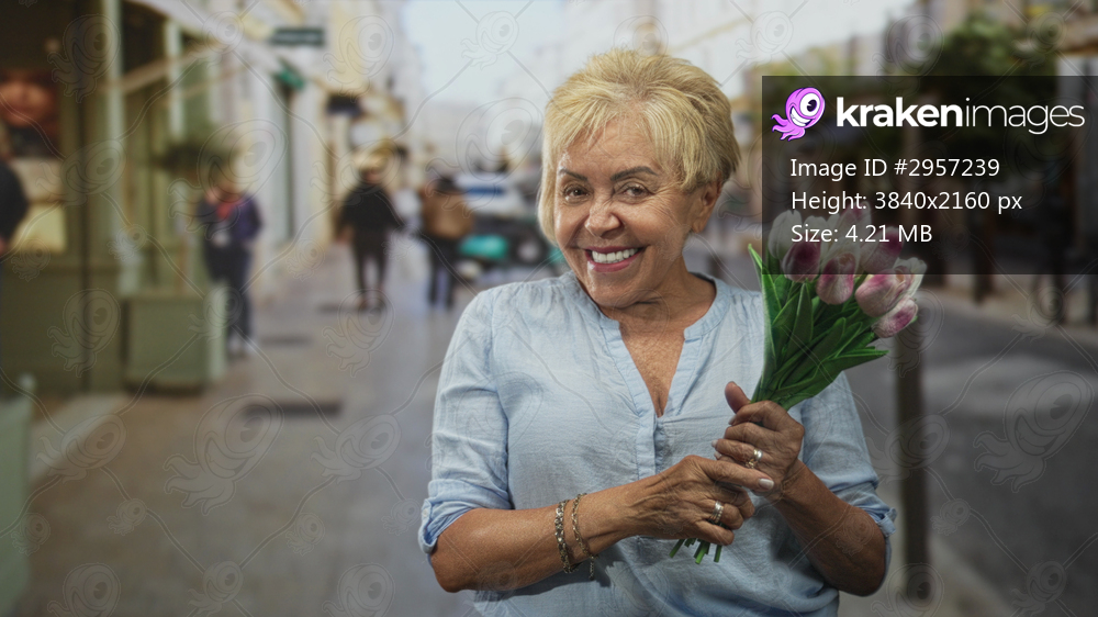 Woman senior holding pink tulip bouquet with hands and smiling while standing on a pedestrian street lined with shops and planters; joy gratitude.