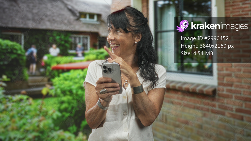 Woman senior holding smartphone, wiping eye with hand beside a brick window on a front garden building, smiling and gesturing with other hand; happiness connection. - Kraken Images