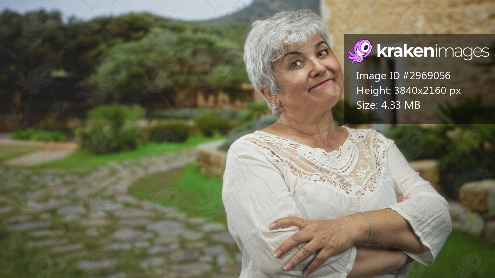 Woman, senior plus size, grey hair, arms crossed smiling in white lace blouse beside a stone building with cobblestone path and shrubs; confidence.