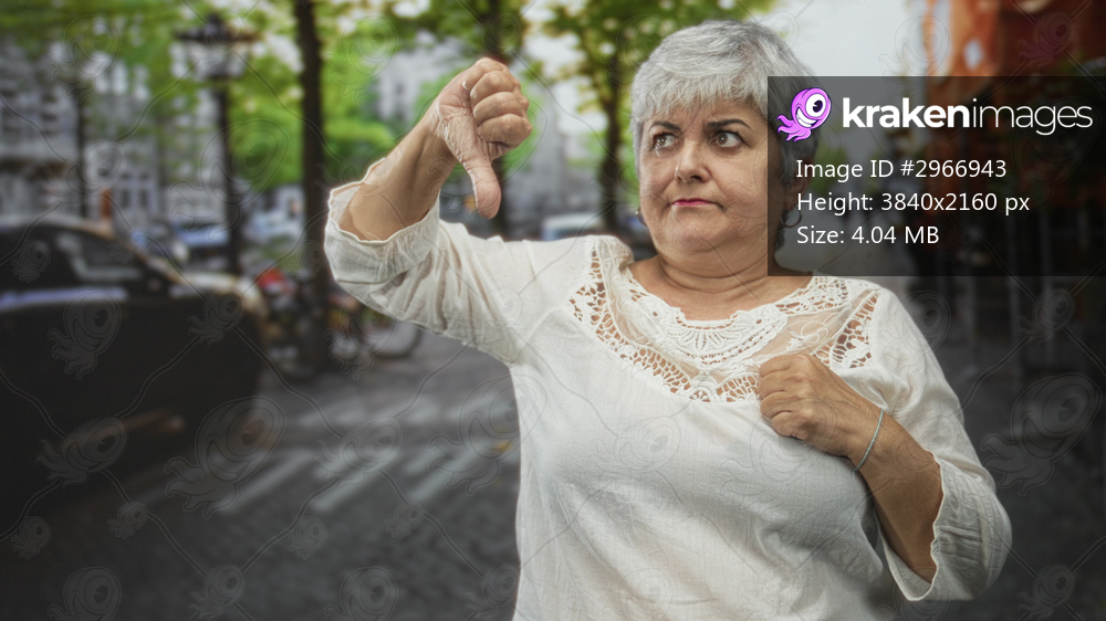 Woman senior plus size with grey hair giving thumbs down while clutching chest in white lace blouse on a cobblestone city street; disapproval resolve.