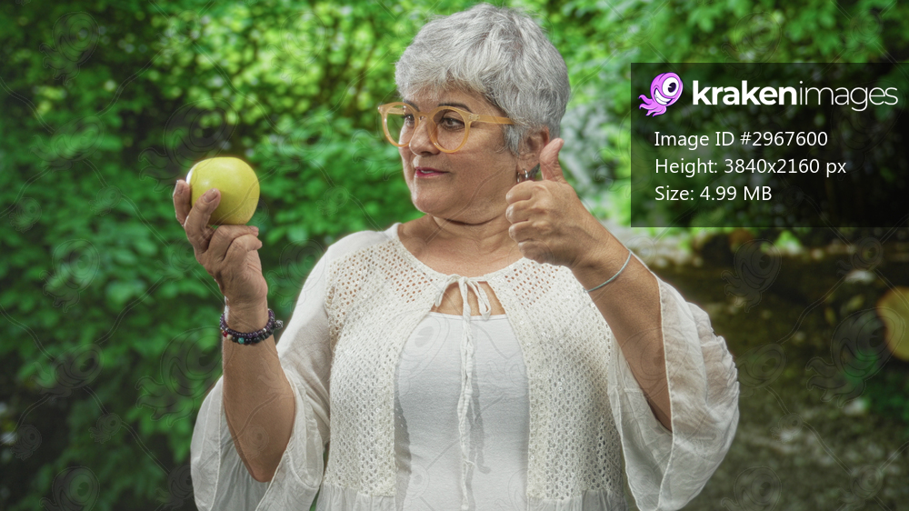 Woman senior plus size with grey hair and glasses holding green apple and giving thumbs up in forest; cheerful vitality.