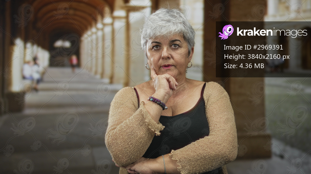 Woman senior plus size with grey hair, hand on chin and crossed arms, wearing bracelets and tank top, posed in a building colonnade; thoughtful dignity. - Kraken Images