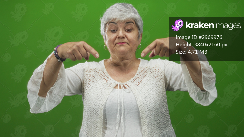 Woman, senior plus size with grey hair, points both index fingers downward while smiling, wearing white blouse and bracelets in studio; playful invitation. - Kraken Images