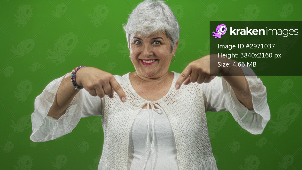 Woman, senior plus size with grey hair, points both index fingers downward while smiling, wearing white blouse and bracelets in studio; playful invitation. - Kraken Images