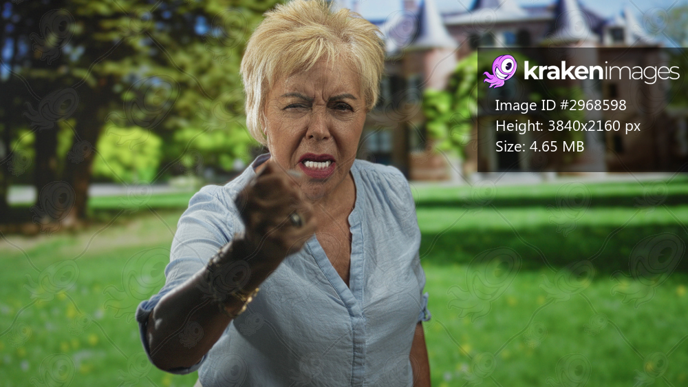 Woman senior points finger toward camera with clenched fist, standing on lawn in front of building; anger defiance.