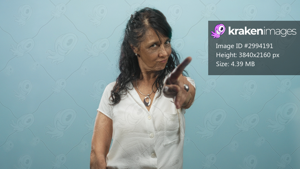 Woman senior points index finger to camera in studio wearing white blouse and pendant showing scolding gesture; warning.