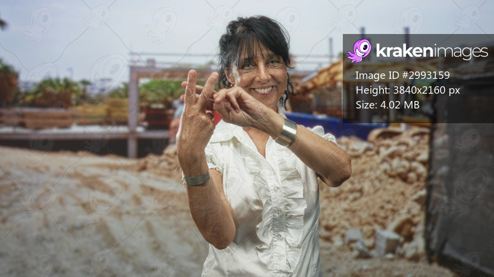 Woman senior smiling in white blouse forms hand sign with fingers toward camera in front of building construction site with excavator and rubble; joy resilience. - Kraken Images
