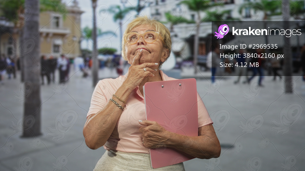 Woman senior wearing glasses holding pink clipboard, hand on chin while standing in busy street; pensive pondering reflection.