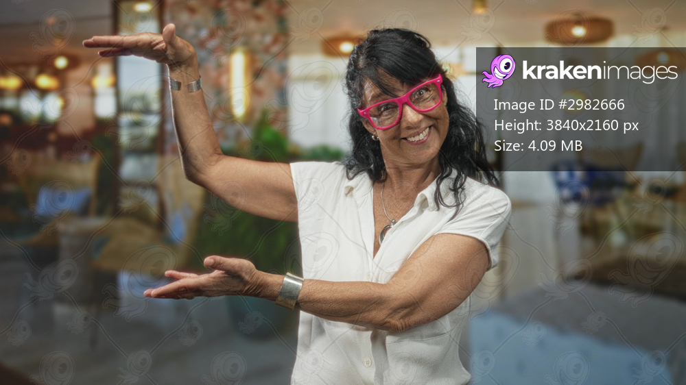 Woman senior wearing pink glasses frames an empty space with open hands and smiling face in a modern building lounge, white shirt visible; welcoming joy. - Kraken Images