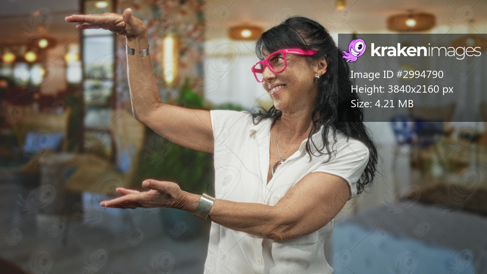 Woman senior wearing pink glasses frames an empty space with open hands and smiling face in a modern building lounge, white shirt visible; welcoming joy. - Kraken Images