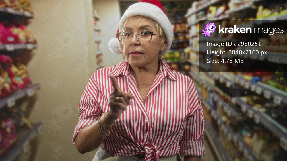 Woman senior wearing red santa hat and red sweater smiles and holds wrapped gift in a studio closeup; holiday joy warmth.