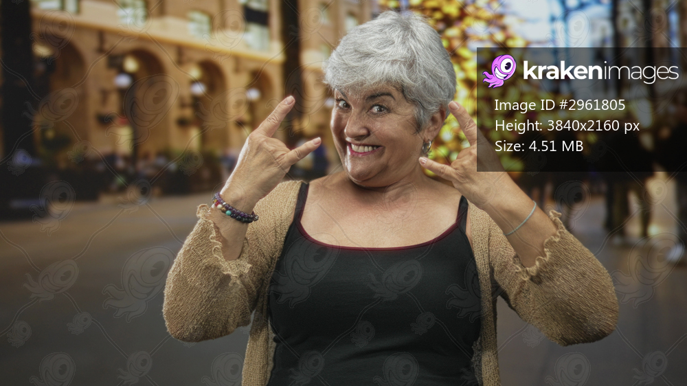 Woman senior wearing tanktop and cardigan showing rock hand gesture with hands and smile in building; playful confidence.