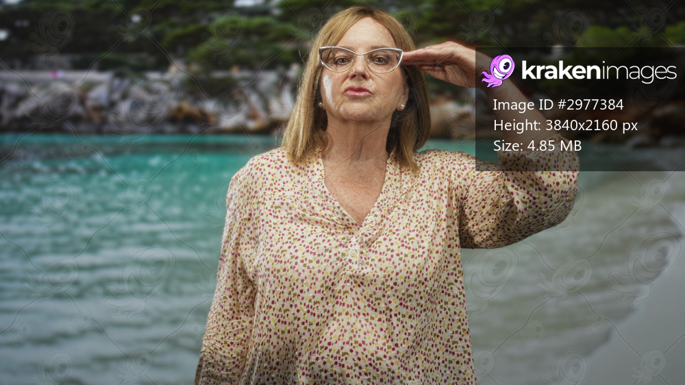 Woman shading eyes with hand and glasses at beach, wearing floral blouse and pearl earring while gazing toward turquoise water; calm confidence focus.