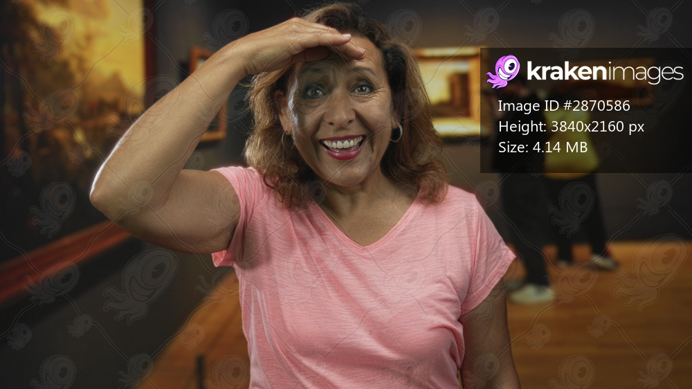 Woman shading eyes with hand and smiling amid paintings in building gallery; wonder discovery curiosity.