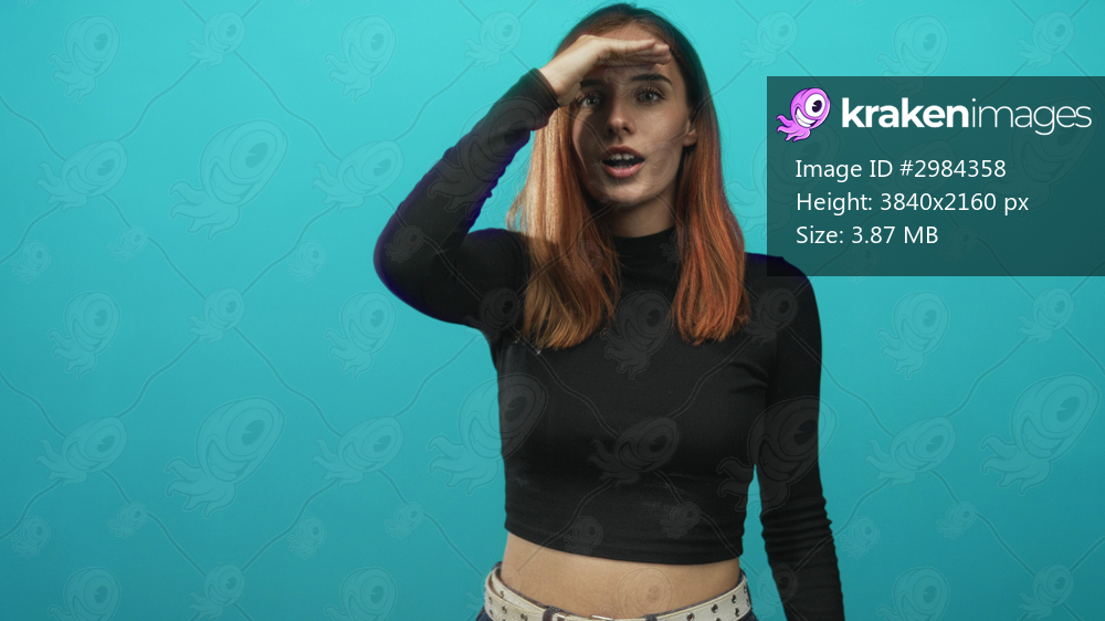 Woman shading eyes with hand to forehead in a studio teal backdrop, wearing black crop top and studded belt; curiosity exploration.