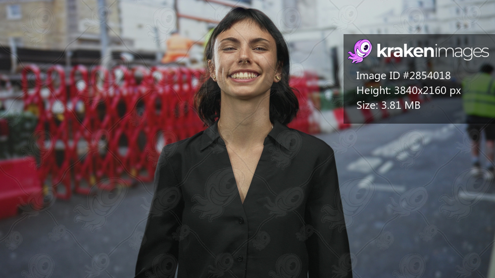 Woman shading eyes with hand to forehead in black shirt on city street near construction fence; anticipation.