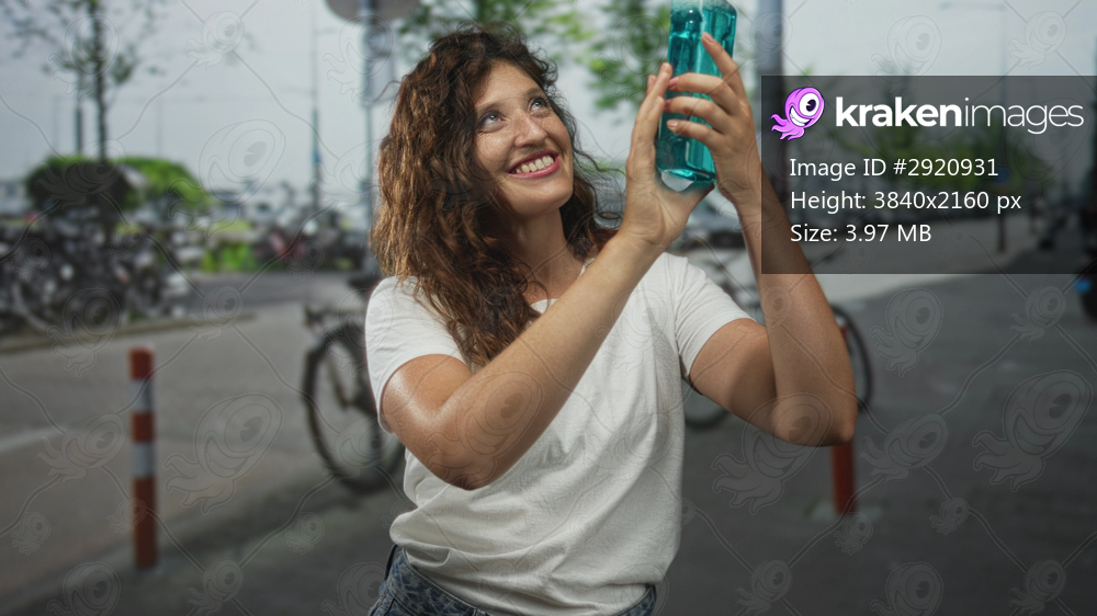 Woman shaking blue bottle with both hands on a busy city street near parked bikes, wearing white t shirt and smiling; joyful.