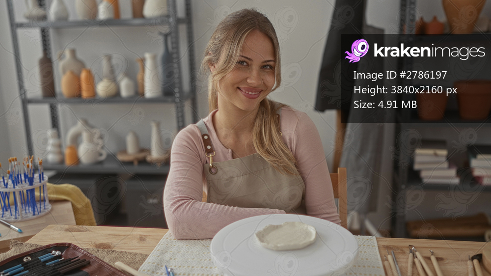 Woman shapes clay disc on spinning wheel inside ceramics studio lined with pottery tools; creativity focus craftsmanship concentration.