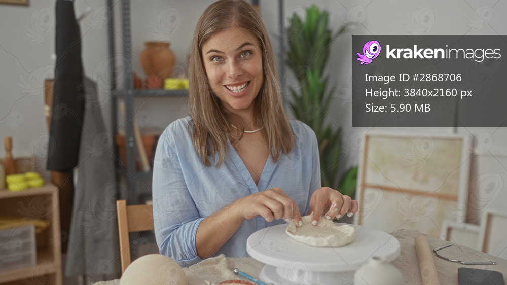 Woman shapes clay with hands on ceramic wheel in art studio surrounded by pottery tools; creativity.