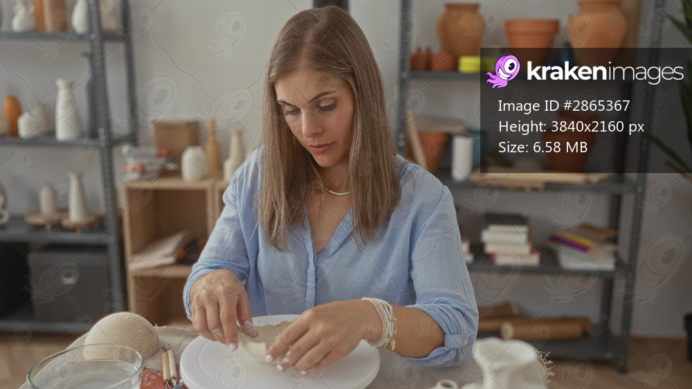 Woman shapes clay with hands on rotating wheel in bright studio filled with pottery shelves and tools; creativity serenity.