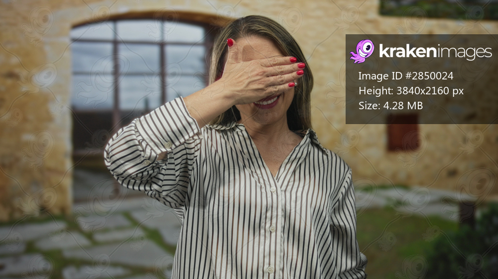 Woman shielding eyes with hand at rustic stone building entrance while wearing eyeglasses under soft daylight; joy.