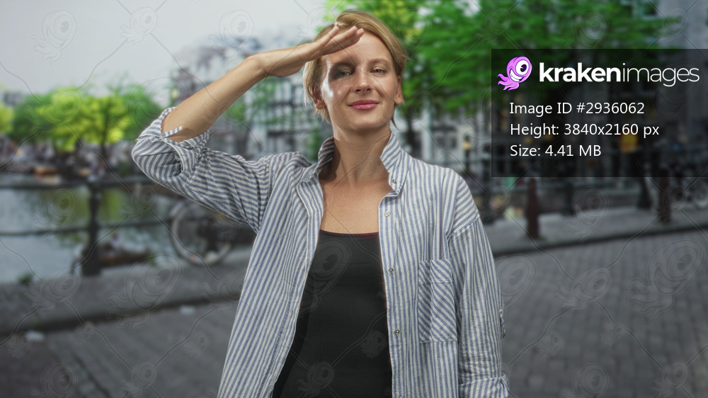 Woman shielding eyes with hand in a salute on cobblestone street by a canal and bicycle, trees visible; contentment travel optimism.