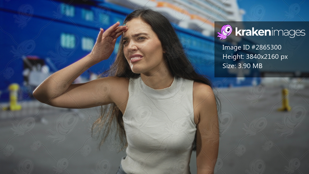Woman shielding eyes with hand to forehead beside a cruise boat at a street pier, squinting toward the horizon; searching concern.